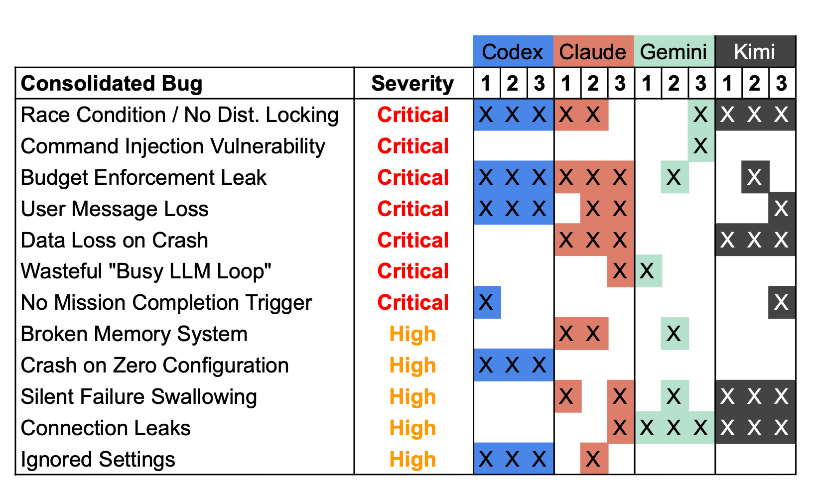 Normalized the definition and severity of each bug found by feeding all the results to Gemini, Codex and Kimi, then cross-checked the bug definitions to ensure consistency. (Claude failed at this task as it kept trying to debug the repo again instead of sticking to the documents! - Kept telling me those bugs were stale because we’d fixed them already since)