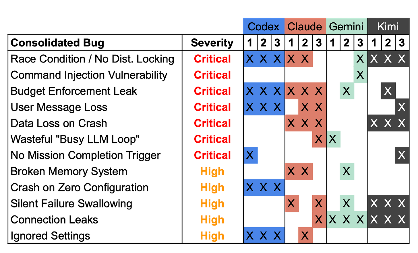 Gemini was the only one to (correctly!) identify the command injection (1/3 times), but also the only one that failed to identify the critical “user message loss”, and also terrible at consistency across runs