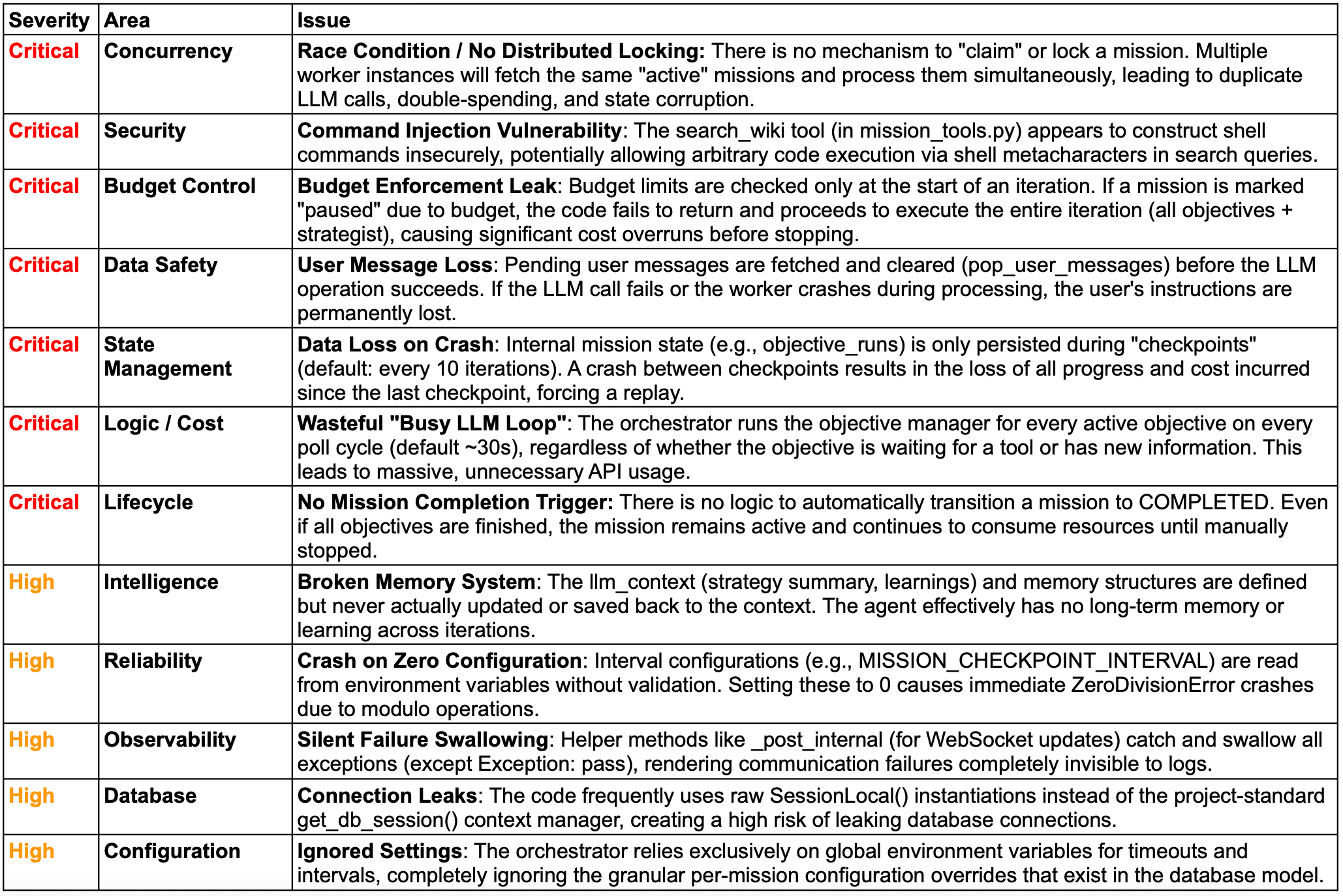 The various agents mostly agreed on how to aggregate the individual bugs, and the top 5-6 were pretty consistent, but disagreed on the severity of each.