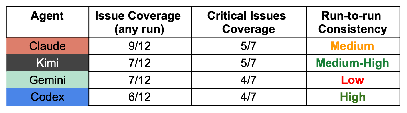 Claude: Best overall breadth and strongest at deep reliability/state-machine style bugs. Weakness: less consistent across 3 runs and tends to include more speculative findings.